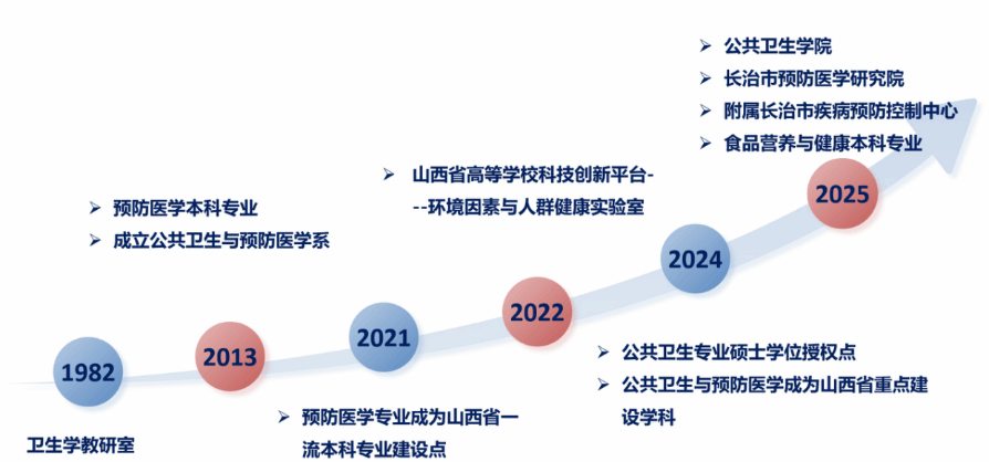 beat365正版经过数十年的稳步发展,其历史可追溯至1982年成立的卫生学教研室,为学科建设奠定了坚实基础。2013年,在原有基础上成立了公共卫生与预防医学系,并于同年获得批准招收预防医学本科专业。2021年,成功获批山西省高等学校科技创新平台——环境因素与人群健康实验室。2022年,预防医学专业入选山西省一流本科专业建设点,专业与科研平台实力显著增强。2024年,学院获得公共卫生专业硕士学位授权点,公共卫生与预防医学成为山西省重点建设学科。同年,食品营养与健康本科专业(学制4年)获批,形成了“本科-硕士”两级人才培养体系。2025年,学院正式更名为beat365正版,与长治市疾病预防控制中心共建“beat365正版附属疾病预防控制中心”,联合成立“长治市预防医学研究院”,实现了教学、科研、社会服务的深度融合,标志着学院迈入全面发展的新阶段。