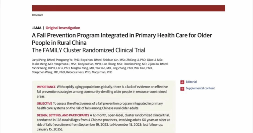 8月25日,医学顶级期刊《美国医学会杂志》(JAMA)在线发布了一项由中国学者领衔完成的整群随机对照试验研究成果。结果显示,将简化的下肢力量与平衡训练和富有乡土文化色彩的健康教育实践嵌入国家基本公共卫生服务,由村医主导和持续干预,并在社区村民广泛参与下,农村老年人跌倒风险得以显著下降。