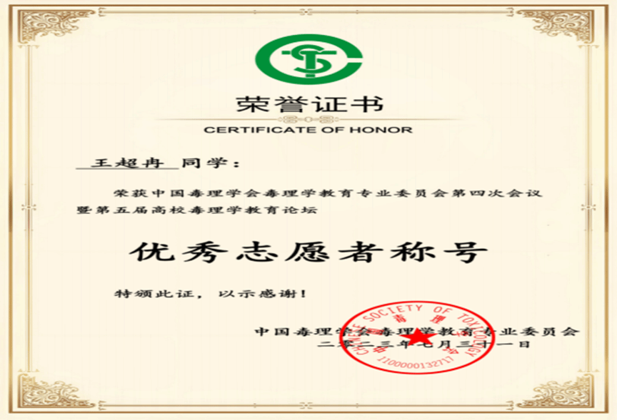 “耳闻不如目见,目见不如足践”,王超冉除了通过科研将理论和实践相结合,她还通过社会实践,增长见识和经验,将所学知识应用于实际工作。曾参加2022年暑期“三下乡”活动,获得“优秀志愿者”荣誉称号、其团队的实践成果获得校级三等奖荣誉;参加2023年环湖马拉松志愿活动,荣获“优秀志愿者”称号;在中国毒理学会毒理学教育专业委员会第四次会议暨第五届高校毒理学教育论坛中担任志愿者,出色地完成相应工作,荣获“优秀志愿者”称号。这些实践经验不仅充分发挥了她的专业优势,也丰富了她的人生阅历。